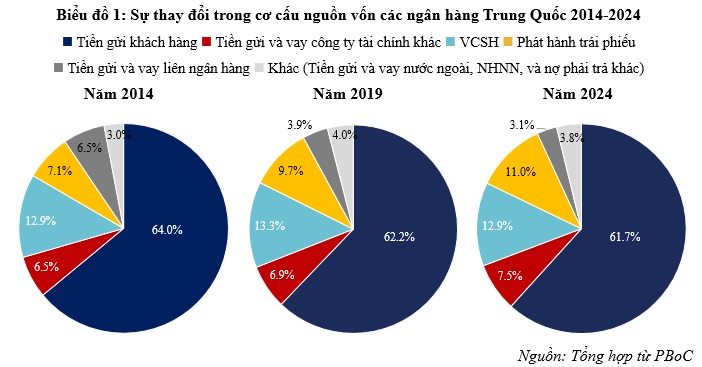 Dựa trên dữ liệu cơ cấu vốn của hệ thống ngân hàng Trung Quốc, tiền gửi khách hàng vẫn là trụ cột chính, chiếm tỷ trọng lớn nhất và duy trì ổn định (từ 64.01% năm 2014 giảm nhẹ xuống 62% vào năm 2024), điều này khẳng định vai trò chủ đạo của nguồn vốn truyền thống. Điểm đáng chú ý là sự gia tăng tiền gửi từ các công ty tài chính khác, chiếm tỷ lệ đáng kể trong tổng nguồn vốn, tăng lên 7.52% vào năm 2024. Nếu cộng gộp khoản mục này, tổng tỷ trọng tiền gửi ước tính đạt gần 70%. Nhờ sự bùng nổ của thanh toán không dùng tiền mặt và sự trỗi dậy của các công ty fintech như Alipay và WeChat Pay đã đóng góp vào việc thu hút lượng lớn tiền gửi cho các ngân hàng. Chẳng hạn, Alipay lưu trữ tiền của khách hàng trong các tài khoản đặc biệt tại các ngân hàng thương mại lớn như Ngân hàng Công thương Trung Quốc (ICBC). Ngoài ra, các ngân hàng còn hợp tác với những nền tảng này để cung cấp trực tiếp dịch vụ tiền gửi có kỳ hạn tới người dùng. Mặt khác, còn giúp các ngân hàng huy động tiền gửi hiệu quả hơn, giảm áp lực đẩy lãi suất huy động lên cao, từ đó có thêm dư địa để duy trì mặt bằng lãi suất cho vay thấp trong thời gian dài.