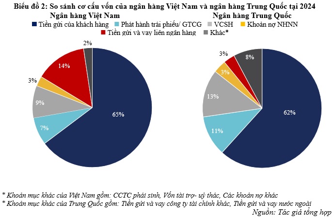 Một điểm khác biệt rõ rệt trong cơ cấu vốn của ngân hàng Việt Nam là dù tỷ trọng phát hành Giấy tờ có giá (GTCG) đã tăng từ 1.71% (2014) lên 7.47% (cuối năm 2024), con số này vẫn khá nhỏ so với mức phát hành trái phiếu của các ngân hàng Trung Quốc. Điều này cho thấy kênh huy động vốn qua thị trường vốn – như trái phiếu và chứng chỉ tiền gửi – vẫn chưa được tận dụng tối đa để bổ sung nguồn vốn cho hệ thống. Trái lại, khoản mục vay liên ngân hàng vẫn chiếm tỷ trọng đáng kể, khoảng 14%, nhấn mạnh sự cần thiết phải nhanh chóng chuyển dịch sang các nguồn vốn ổn định và bền vững hơn.