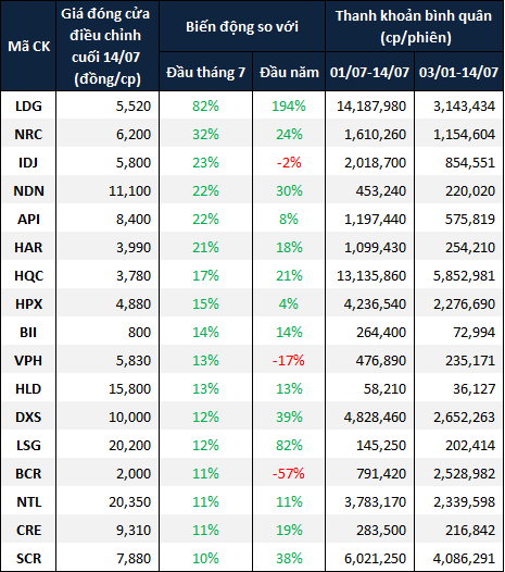 Trong số các cổ phiếu penny, LDG dẫn đầu về mức tăng với 82% chỉ trong nửa đầu tháng 7. Tính cả phiên 14/07, cổ phiếu này đã có 7 phiên tăng trần liên tiếp (04-14/07) và cũng là phiên tăng trần thứ 12 trong 13 phiên gần nhất (26/06-14/07). Đặc biệt, với khối lượng giao dịch đạt hơn 42.8 triệu cp, phiên 14/07 trở thành phiên có thanh khoản kỷ lục từ trước đến nay của cổ phiếu này.