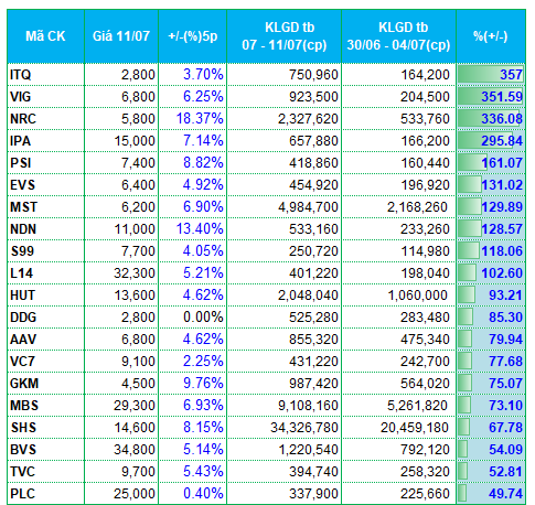 Song song đó, cổ phiếu chứng khoán ở sàn HNX cũng đã có một tuần bứt tốc về thanh khoản. VIG, PSI, EVS, MBS, SHS, BVS cùng các cổ phiếu thuộc nhóm quỹ như IPA, TVC lọt vào top cổ phiếu tăng mạnh thanh khoản tại sàn HNX.