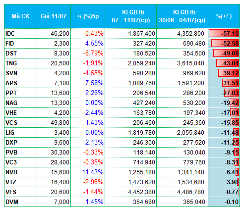 * Danh sách các mã tăng, giảm thanh khoản nhiều nhất xét đến khối lượng giao dịch bình quân trên 100,000 đơn vị/phiên.