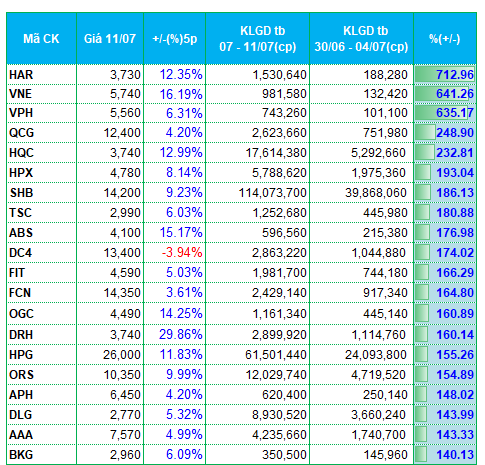 Các mã khác như QCG, HQC, HPX, DRH, NRC, L14, AAV cùng lọt vào top cổ phiếu bứt phá mạnh về thanh khoản.