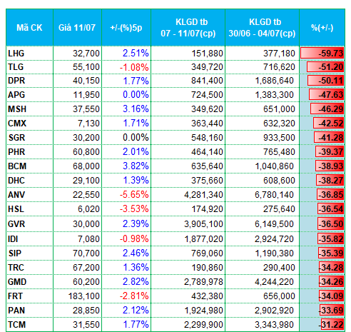 Cổ phiếu thuộc các ngành xuất khẩu cũng không mấy hút tiền. Ở nhóm thủy sản, CMX, ANV, IDI là các đại diện giảm mạnh thanh khoản. Với nhóm dệt may, MSH, TCM, TNG, SVN giảm thanh khoản trong khoảng 40 - 45%.