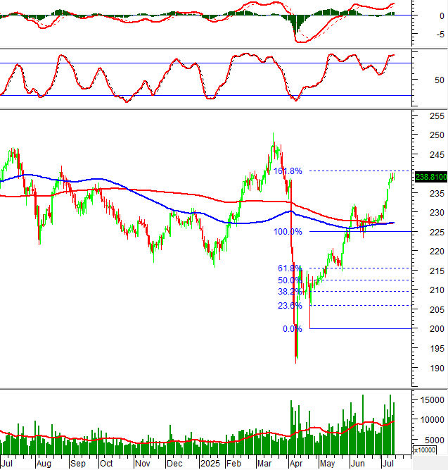 Bên cạnh đó, chỉ số đang kiểm tra lại ngưỡng Fibonacci Projection 161.8% (tương đương vùng 239-242 điểm) trong bối cảnh chỉ báo Stochastic Oscillator đang trong trung quá mua (overbought). Nếu chỉ báo cho tín hiệu bán trở lại và rơi khỏi vùng này trong các phiên tới thì rủi ro điều chỉnh sẽ tăng cao.