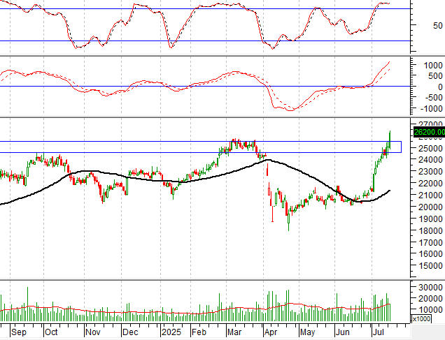 Hiện tại, giá đã vượt thành công vùng đỉnh 52 tuần gần nhất (tương đương vùng 24,500-25,500) , đây cũng là đỉnh cao nhất mọi thời đại của giá trong bối cảnh đường MACD tiếp tục hướng lên sau khi cho tín hiệu mua.