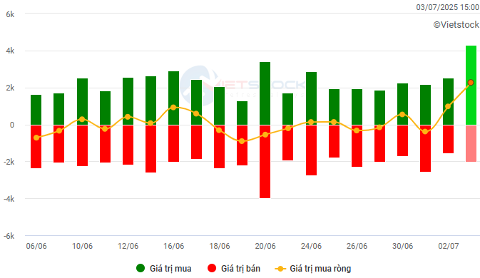 Biến động của dòng tiền từ khối ngoại: Khối ngoại tiếp tục mua ròng trong phiên giao dịch ngày 03/07/2025. Nếu nhà đầu tư nước ngoài duy trì hành động này trong những phiên tới thì tình hình sẽ trở nên tích cực hơn.