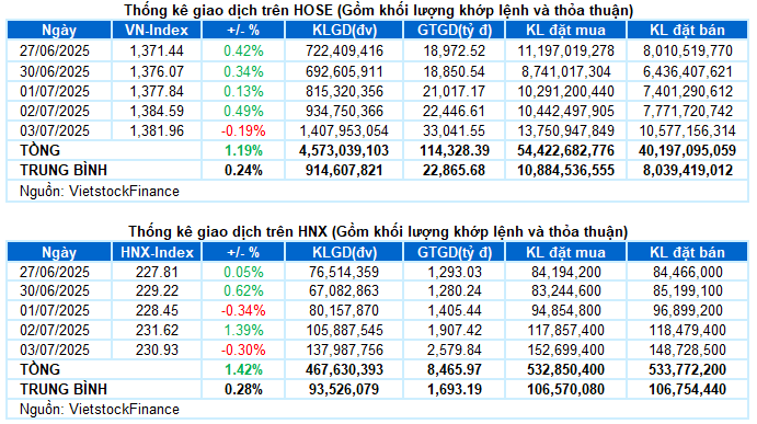 - Các chỉ số chính giảm điểm trong phiên giao dịch ngày 03/07. Cụ thể, VN-Index lùi về mốc 1,381.96 điểm, giảm 0.19%; HNX-Index kết phiên tại 230.93 điểm, giảm 0.3%.