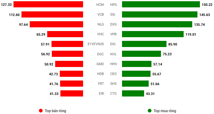 Giá trị giao dịch ròng theo mã cổ phiếu. Đvt: Tỷ đồng
