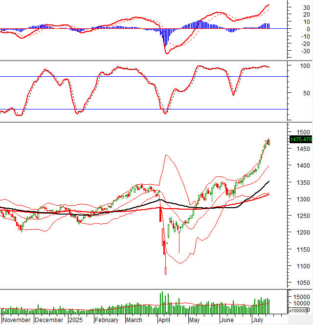 VN-Index quay lại đà tăng sau phiên điều chỉnh trước đó với khối lượng giao dịch duy trì ở mức cao trên trung bình 20 phiên, cho thấy dòng tiền vẫn đang hỗ trợ tích cực cho xu hướng thị trường. Tuy vậy, rủi ro điều chỉnh kỹ thuật vẫn cần được lưu ý trong bối cảnh chỉ số đang ở vùng kháng cự 1,470-1,480 điểm và chỉ báo Stochastic Oscillator đã cho tín hiệu bán trong vùng quá mua (overbought). Nếu xảy ra điều chỉnh, vùng 1,395-1,400 điểm sẽ là hỗ trợ quan trọng mà chỉ số cần giữ vững để duy trì xu hướng tăng.