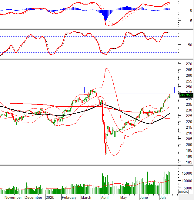 HNX-Index tăng điểm trở lại và chuẩn bị hướng đến vùng đỉnh cũ tháng 3/2025 (tương đương 245-250 điểm). Khối lượng giao dịch duy trì tốt trên mức trung bình 20 phiên cho thấy dòng tiền vẫn tham gia sôi động.