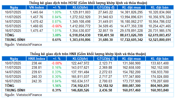 - Các chỉ số chính tăng điểm trở lại trong phiên giao dịch ngày 16/07. VN-Index tăng 1.1% so với phiên trước, đạt 1,475.47 điểm; HNX-Index cũng tăng 0.84%, kết phiên tại mức 242.35 điểm.