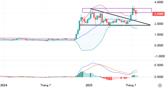 Trong khung đồ thị tuần, sau khi phá vỡ cạnh trên của mẫu hình Descending Triangle thì giá đang giằng co tại vùng đỉnh tháng 01/2025 (tương đương vùng 3-3.4 USD).