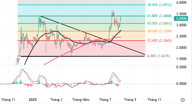 Từ các yếu tố kỹ thuật trên, người viết dự kiến XRP sẽ còn rung lắc tại vùng đỉnh cũ tháng 01/2025 (tương đương vùng 3-3.4 USD). Tuy nhiên, nếu giá vượt vùng này thì xu hướng tăng trong tương lai sẽ bền vững hơn và vùng giá mục tiêu (Price Target) tiềm năng tiếp theo là ngưỡng Fibonacci Projection 78.6% (tương đương 3.8-3.9 USD).