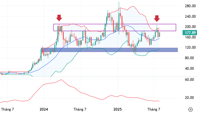 Theo khung đồ thị tuần, SOL bắt đầu suy yếu tại vùng đỉnh cũ tháng 03/2024 (tương đương vùng 190-210 USD) và vận động quanh đường Middle của Bollinger Bands.