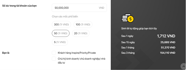 Mô phỏng lợi nhuận khi khách hàng Techcombank kích hoạt sinh lời tự động với số dư trong tài khoản thanh toán