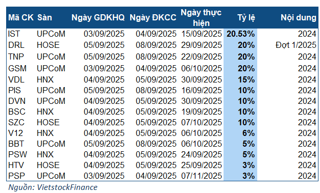 Với thực tế chỉ 3 phiên giao dịch (03-05/09/2025), vẫn có 14 doanh nghiệp chốt quyền chia cổ tức bằng tiền trong tuần sau nghỉ lễ Quốc khánh 02/09. Tỷ lệ cao nhất là 20.53%, tương đương cổ đông nắm 1 cp nhận được 2,053 đồng.