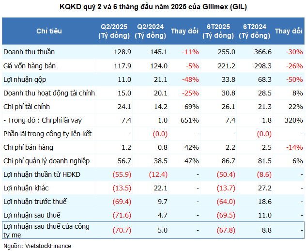 Theo BCTC hợp nhất quý 2/2025, Gilimex báo lỗ gần 71 tỷ đồng, trong khi cùng kỳ năm trước lãi 5 tỷ đồng. Doanh thu giảm 11% còn chưa đến 129 tỷ đồng, biên lãi gộp co hẹp từ 14.5% xuống 8.5%.