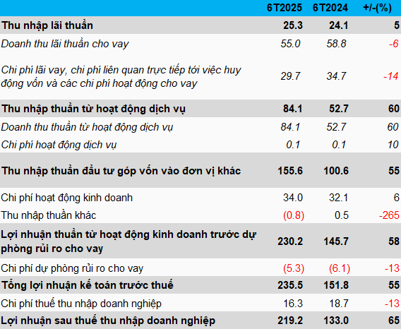Trong nửa đầu năm 2025, HFIC lãi ròng hơn 219 tỷ đồng, tăng 65% so với nửa đầu năm 2024 và thực hiện 60% kế hoạch năm. Kết quả này được thúc đẩy chủ yếu bởi cổ tức và lợi nhuận được chia trong kỳ tăng vọt.