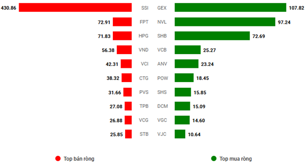 Khối ngoại tiếp tục đẩy mạnh bán ròng với giá trị hơn 697 tỷ đồng trên cả ba sàn. Đứng đầu top bán ròng là SSI với giá trị 430.89 tỷ, bỏ xa các cổ phiếu còn lại. Trong khi đó, lực mua tập trung chủ yếu ở ba mã GEX, NVL và SHB với giá trị lần lượt là 107.82 tỷ, 97.24 tỷ và 72.69 tỷ.