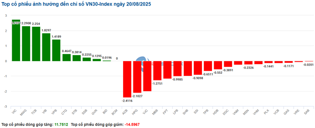 | Top 10 cổ phiếu tác động mạnh tới VN-Index phiên 20/08/2025 (tính theo điểm) | ||