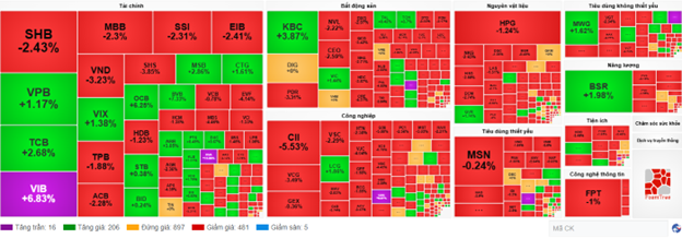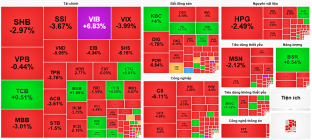 Các nhóm ngành vốn hóa lớn như tài chính và công nghiệp đè nặng áp lực lên chỉ số chung khi lần lượt lao dốc 1.48% và 2.17%. Hầu hết các cổ phiếu đều chìm sâu trong sắc đỏ, hàng loạt các cổ phiếu ghi nhận áp lực bán trên 2% như VCB, MBB, ACB, LPB, HDB, SSI, TPB, SHB; VJC, MVN, GEX, GEE, VGC, VCG, PHP và VTP.