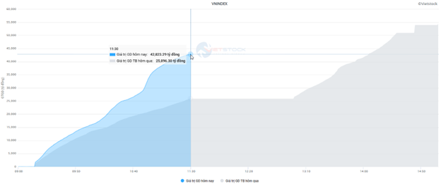Thanh khoản thị trường tăng mạnh trong sáng nay. Khối lượng giao dịch trên sàn HOSE đạt hơn 1.5 tỷ đơn vị, tương đương giá trị gần 43 ngàn tỷ đồng, tăng mạnh 65.4% so với phiên trước. Tương tự, HNX ghi nhận giá trị 3.1 ngàn tỷ đồng, tăng 27.7% so với phiên trước.