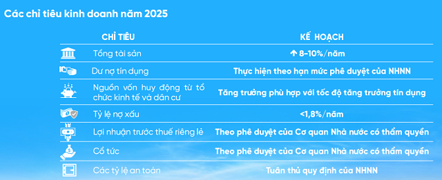 Theo đó, VietinBank đề ra mục tiêu năm 2025 tăng trưởng tổng tài sản 8-10%. Dư nợ tín dụng tăng trưởng theo phê duyệt của Ngân hàng Nhà nước (NHNN). Nguồn vốn huy động phù hợp với tốc độ tín dụng. Tỷ lệ nợ xấu kiểm soát dưới 1.8%. Lợi nhuận trước thuế riêng lẻ cũng sẽ theo phê duyệt của cơ quan Nhà nước có thẩm quyền.