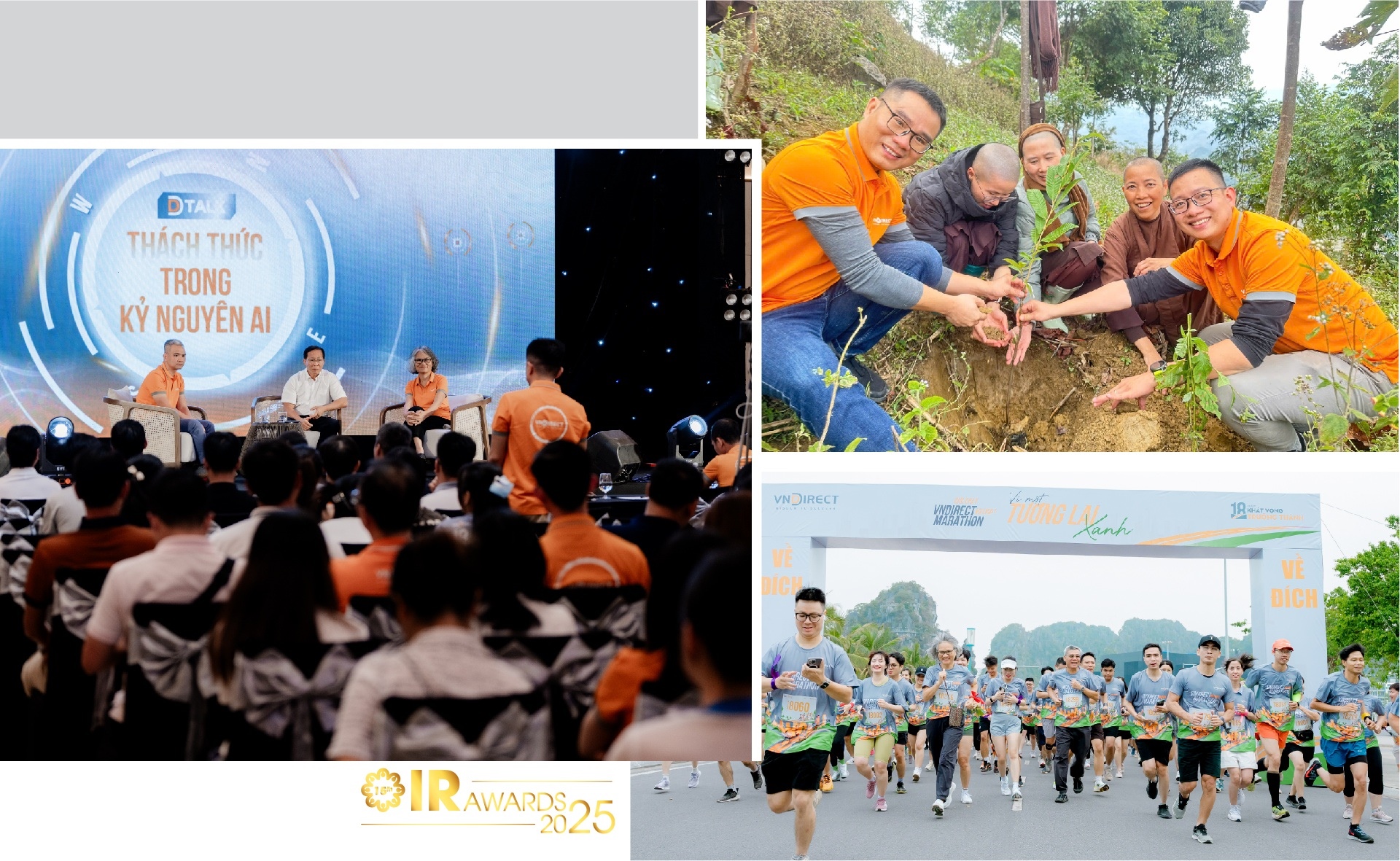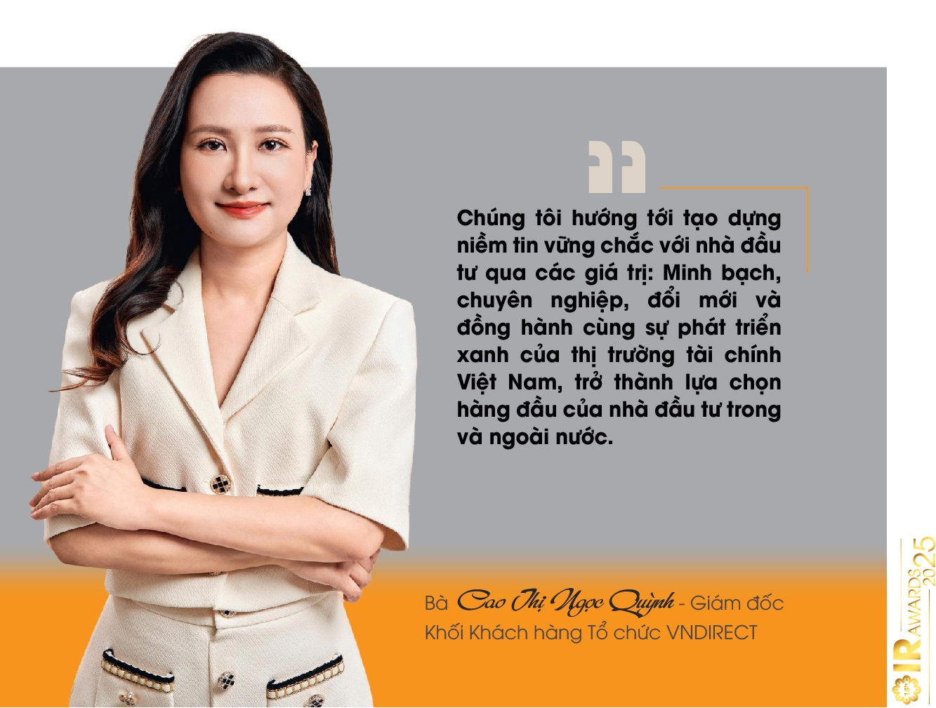 - Trước những biến động thị trường, Ban IR VNDIRECT đã đóng vai trò “giữ lửa” niềm tin cho nhà đầu tư. Chúng tôi kịp thời công bố thông tin minh bạch, tổ chức nhiều hoạt động tương tác hai chiều như ĐHĐCĐ, hội thảo Dtalk, gặp gỡ nhà đầu tư trong và ngoài nước; đồng thời tăng cường minh bạch BCTC và chủ động chăm sóc, tri ân khách hàng. Nhờ đó, VNDIRECT tiếp tục duy trì sự tin tưởng của nhà đầu tư và khẳng định vị thế tiên phong về minh bạch, chuyên nghiệp, phát triển bền vững trên thị trường.