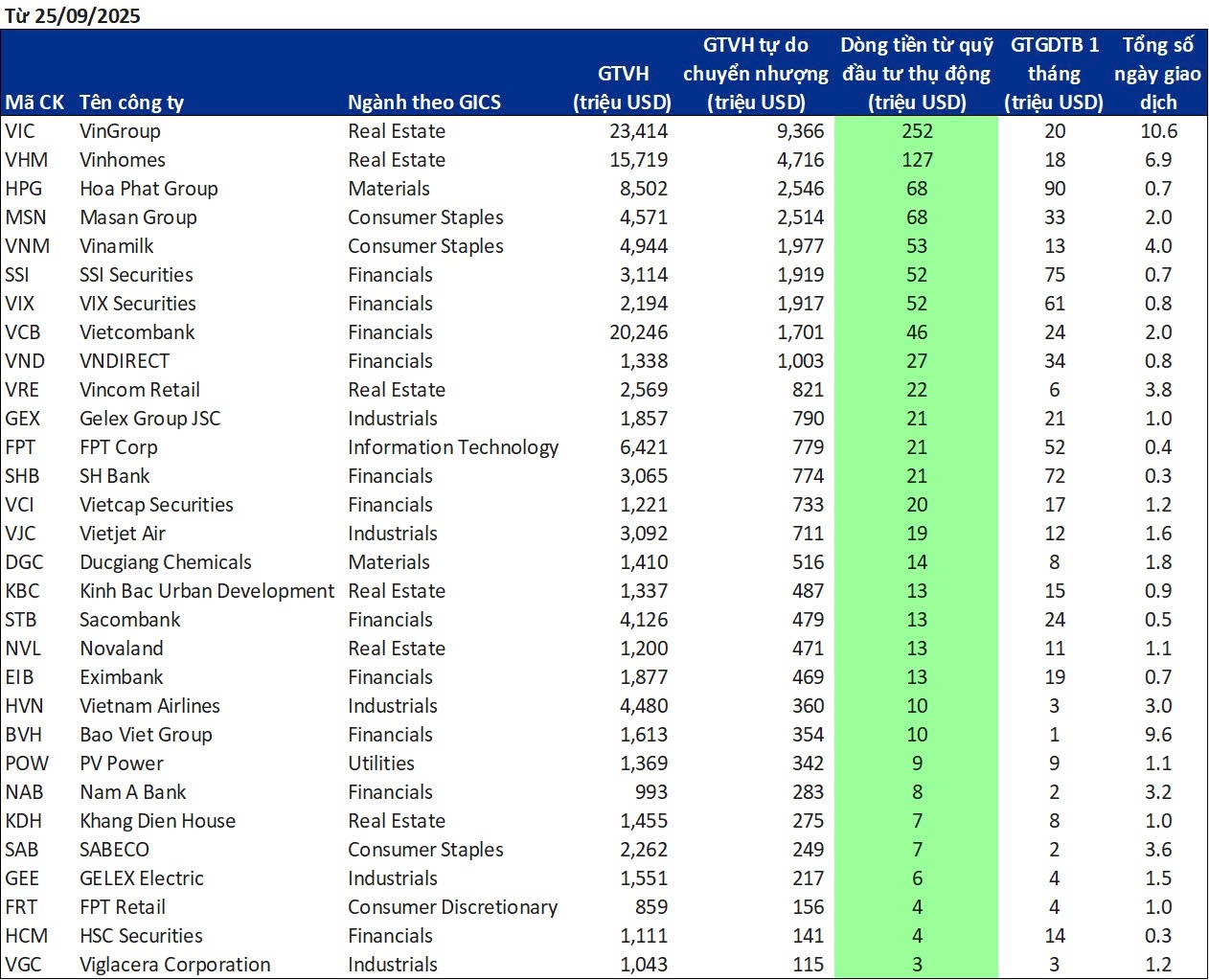 Danh sách 30 cổ phiếu tiềm năng có thể được các quỹ chỉ số bổ sung vào danh mục. Nguồn: Vietcap