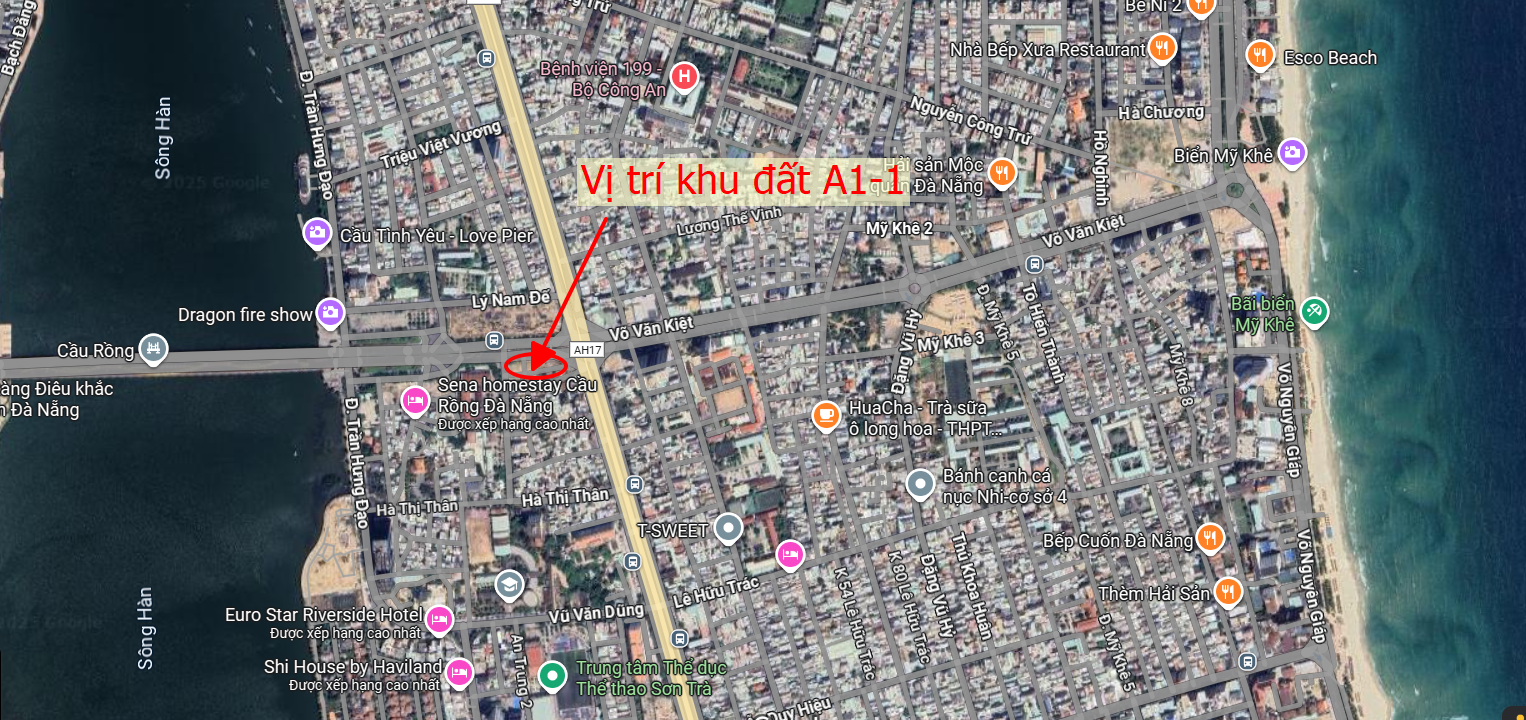 Tâm điểm là khu đất thứ hai có ký hiệu A1-1, tọa lạc ngay mặt tiền đường Võ Văn Kiệt, phường An Hải, với diện tích hơn 4,027 m2, vị trí kết nối trực tiếp đến cầu Rồng và bãi biển Mỹ Khê. Mức giá sàn được đưa ra cho lô đất này lên hơn 153.3 triệu đồng/m2, tương đương tổng giá trị khởi điểm gần 618 tỷ đồng.