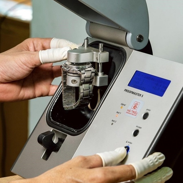 Máy ProofMaster PRO tại Trung tâm bảo dưỡng Đồng Hồ Hải Triều mô phỏng áp suất nước thực tế để kiểm tra độ kín của đồng hồ mà không gây tổn hại. Máy phát hiện cả những khe hở cực nhỏ ở gioăng hoặc núm vặn - yếu tố mắt thường không thể nhìn thấy.