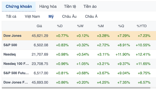 Kết thúc phiên giao dịch ngày 04/09, chỉ số S&P 500 tiến 0.83% lên 6,502.08 điểm, còn chỉ số Nasdaq Composite cộng 0.98% lên 21,707.69 điểm. Chỉ số Dow Jones tăng 350.06 điểm (tương đương 0.77%) lên 45,621.29 điểm. Đây là lần đóng cửa ở mức cao kỷ lục thứ 21 của S&P 500 trong năm nay.