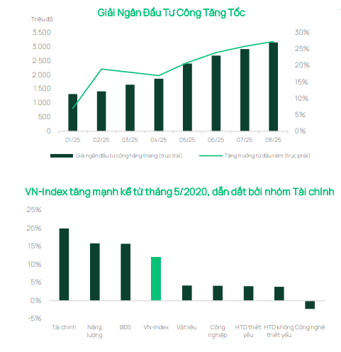 Các chỉ số vĩ mô và ngành đều củng cố bức tranh tích cực cho thị trường. Giải ngân đầu tư công trong tháng 8 tăng mạnh 34.5% so với cùng kỳ; trong khi vốn FDI thực hiện tăng 12.5%, nâng tổng vốn đăng ký trong 8 tháng lên 26.1 tỷ USD, tăng 27.3% so với cùng kỳ, cho thấy sự hỗ trợ vốn đầu tư vững chắc từ cả khu vực công và tư nhân. Hoạt động thương mại duy trì mức tăng trưởng hai chữ số, với kim ngạch xuất khẩu tháng 8 tăng 14.5% và nhập khẩu tăng 17.7% so với cùng kỳ, đem lại thặng dư thương mại khoảng 3.7 tỷ USD. Lạm phát tiếp tục được kiểm soát tốt, với CPI tháng 8 tăng 3.2% so với cùng kỳ và lạm phát cơ bản ổn định quanh mức 3.2%, giảm nhẹ so với tháng 7. Sản xuất công nghiệp tăng 8.9% so với cùng kỳ, trong khi chỉ số PMI giảm nhẹ về mức 50.4 - số lượng đơn hàng quay trở lại mức bình thường sau khi tăng mạnh trong tháng trước.
