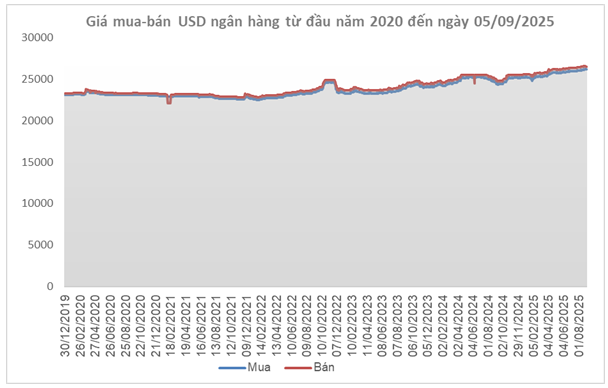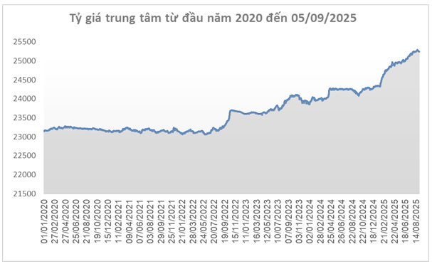 Trong nước, tỷ giá trung tâm ngày 05/09 được Ngân hàng Nhà nước niêm yết ở mức 25,248 đồng/USD, nhích nhẹ 8 đồng so với cuối tuần trước. Với biên độ ±5%, tỷ giá tại các ngân hàng thương mại được phép dao động trong khoảng 23,986 – 26,510 đồng/USD.