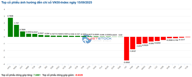| Top 10 cổ phiếu tác động mạnh tới VN-Index phiên 15/09/2025 (Tính theo điểm) | ||