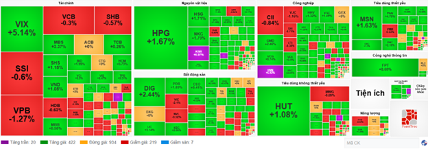 So với đầu phiên, bên mua tiếp tục kiểm soát tốt thị trường chung với bên mua có phần áp đảo. Số mã tăng là 422 mã và số mã tăng là 219 mã.