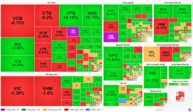 HPG, MSN là hai cổ phiếu tác động tích cực đến chỉ số VN30 với mức đóng góp lần lượt là 2.78 điểm và 1.73 điểm. Ở chiều ngược lại, nhóm cổ phiếu gồm VIC, VHM, VPB và MWG đang chịu áp lực bán và lần lượt lấy đi 3.43 điểm, 1.81 điểm, 1.07 điểm và 0.95 điểm từ chỉ số chung.