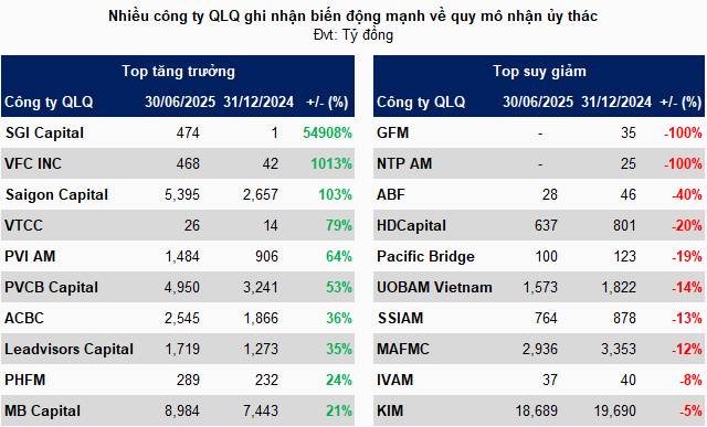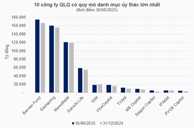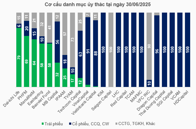 Thống kê trên 43 công ty quản lý quỹ (QLQ) đang hoạt động trên thị trường chứng khoán Việt Nam tại thời điểm 30/6/2025, quy mô danh mục nhận ủy thác đạt hơn 614 ngàn tỷ đồng, gấp 61 lần tổng tài sản. Quy mô này tăng 2% so với cuối quý 1 và tăng 5% so với đầu năm.