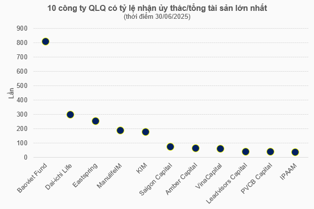 Tầm ảnh hưởng của hoạt động ủy thác còn được thể hiện qua việc có đến 38 công ty phát sinh mảng này. Trong đó, 30 công ty nhận ủy thác lớn hơn, thậm chí gấp từ hàng chục đến hàng trăm lần tổng tài sản. Còn lại, 5 công ty không nhận ủy thác là QLQ Rồng Việt (VDAM), QLQ Pavo Capital (PCAM JSC), QLQ BVIM, QLQ NTP (NTP AM), QLQ Genesis (GFM) và QLQ Đầu tư Chứng khoán An Bình (ABF).