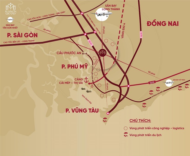 Phú Mỹ giữ vị trí trung chuyển không thể thay thế khi nằm ngay tam giác vàng: cảng biển quốc tế – sân bay quốc tế – mạng lưới cao tốc liên vùng. Cảng Cái Mép – Thị Vải: Lọt top 30 cảng container lớn nhất thế giới theo sản lượng thông qua, thứ 7 toàn cầu về hiệu suất hoạt động, thuộc nhóm cảng nước sâu hiếm hoi tại Việt Nam có thể tiếp nhận tàu trọng tải trên 200.000 DWT. Đây là cửa ngõ xuất nhập khẩu chiến lược của miền Nam, trực tiếp kết nối các tuyến hàng hải xuyên Thái Bình Dương. Sân bay quốc tế Long Thành: chỉ cách Phú Mỹ 25 phút di chuyển, được OAG dự báo rất có thể sẽ gia nhập CLB sân bay 100 triệu lượt khách/năm, đứng Top 6 sân bay có quy mô lớn nhất thế giới khi hoàn thiện. Đây chính là lợi thế chiến lược đưa Phú Mỹ trở thành “trạm trung chuyển” song hành cảng biển – hàng không của Việt Nam. Hạ tầng giao thông đa chiều: Phú Mỹ kết nối trực tiếp với cao tốc Biên Hòa – Vũng Tàu, cao tốc TP.HCM – Long Thành – Dầu Giây, Quốc lộ 51, đường vành đai liên vùng, liên cảng và sắp tới là hệ thống đường sắt đô thị kết nối cảng – sân bay.