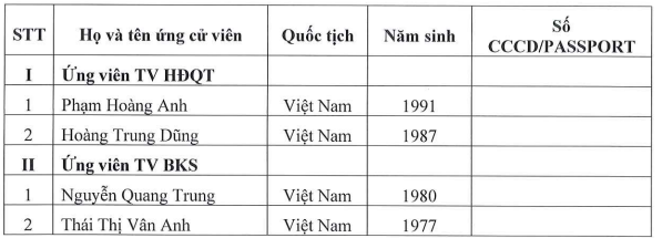 Các ứng viên HĐQT bao gồm ông Phạm Hoàng Anh - có nền tảng tài chính, từng làm việc tại Chứng khoán MB và Ngân hàng OCB, hiện là Phó Tổng Giám đốc ConnectLog Việt Nam; và ông Hoàng Trung Dũng - Phó Chủ tịch CTCP Cầu đường bộ Hải Dương, đồng thời là Trưởng nhóm Tư vấn đầu tư tại Chứng khoán Bảo Việt.