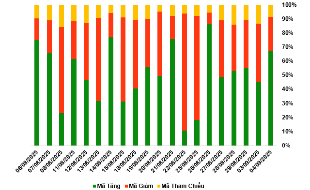 Kết thúc phiên giao dịch ngày 04/09/2025, toàn thị trường có 173 mã tăng, 64 mã giảm và 22 mã tham chiếu.