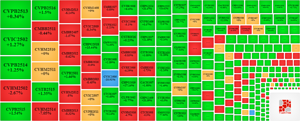 Trong phiên giao dịch ngày 04/09/2025, bên mua tiếp tục dẫn dắt thị trường khiến phần lớn các mã chứng quyền tăng giá. Cụ thể, các mã chứng quyền lớn trong nhóm tăng giá là CVPB2513, CVIC2502, CSTB2515 và CHPG2518.
