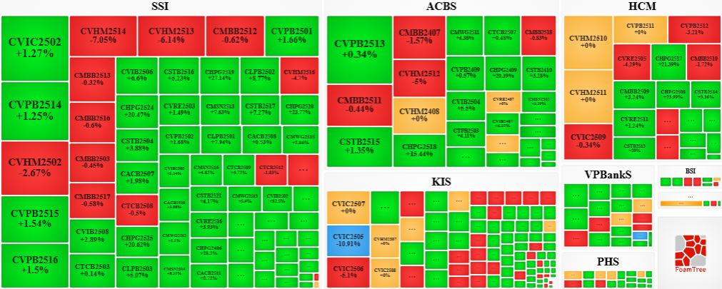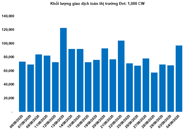 Khối lượng giao dịch toàn thị trường trong phiên 04/09 đạt 96.72 triệu CW, tăng 42.29%; giá trị giao dịch đạt 252.73 tỷ đồng, tăng 46.2% so với phiên 03/09. Trong đó, CHPG2518 là mã dẫn đầu thị trường về khối lượng và giá trị giao dịch, với tổng khối lượng đạt 4.99 triệu CW, tương đương giá trị 14.33 tỷ đồng.