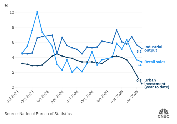 Bắc Kinh đang phải đối mặt với thách thức kinh tế ngày càng lớn khi hàng loạt chỉ số quan trọng được công bố vào ngày 15/09 cho thấy sự suy giảm tiếp tục sâu rộng, với cả doanh số bán lẻ và sản xuất công nghiệp đều thấp hơn dự báo của giới phân tích.