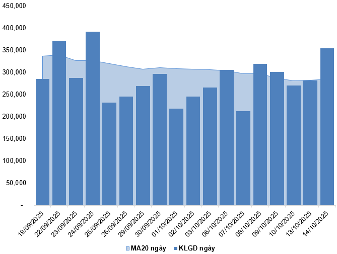 Trong phiên giao dịch ngày 14/10/2025, VN30-Index tăng nhẹ đồng thời xuất hiện mẫu hình nến thân nhỏ kèm theo khối lượng giao dịch vượt mức trung bình 20 phiên cho thấy tâm lý nhà đầu tư khá phân vân.