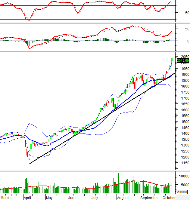 Hiện tại, chỉ số vẫn bám sát Upper Band của Bollinger Bands trong khi chỉ báo MACD vẫn tiếp tục tăng sau khi cho tín hiệu mua. Điều này cho thấy xu hướng tăng trung hạn vẫn còn.