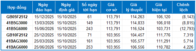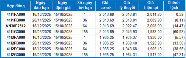 Dựa trên phương pháp định giá hợp lý với thời điểm khởi đầu ngày 15/10/2025, khung giá hợp lý của các hợp đồng tương lai đang được giao dịch trên thị trường được thể hiện như sau: