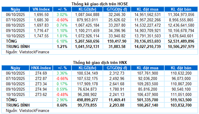 Giao dịch: Các chỉ số chính tăng giảm trái chiều trong phiên giao dịch ngày 10/10. VN-Index tiếp tục bứt phá mạnh 1.81%, lên mức 1,747.55 điểm, trong khi HNX-Index điều chỉnh 0.48%, xuống còn 273.62 điểm. Xét cho cả tuần, VN-Index tăng tổng cộng 101.73 điểm (+6.18%), còn HNX-Index có thêm 7.87 điểm (+2.96%) so với tuần trước.