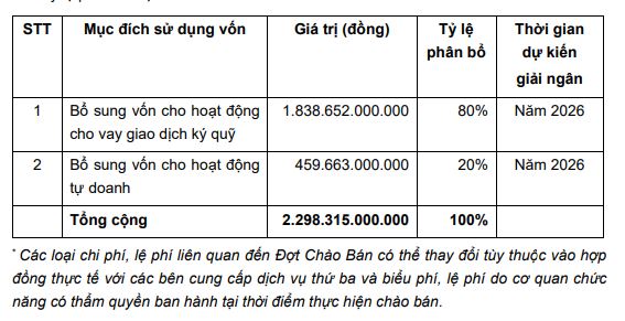 Tổng số tiền dự kiến thu được từ đợt chào bán cổ phần riêng lẻ tối thiểu là gần 2.3 ngàn tỷ đồng. Số tiền này sau khi trừ các khoản chi phí, lệ phí liên quan đến đợt chào bán sẽ được dùng cho các mục đích như sau: Bổ sung vốn cho hoạt động cho vay giao dịch ký quỹ (tỷ lệ 80%, 1.8 ngàn tỷ đồng), bổ sung vốn cho hoạt động tự doanh (tỷ lệ 20%, gần 460 tỷ đồng).